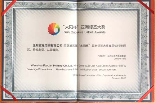 本报讯,中国标签业顶尖行业盛会––2016“太阳杯”亚洲标签大奖颁奖盛典在上海成龙电影艺术馆隆重举行。我司获得了2016“太阳杯”亚洲标签大奖食品类奖铜奖。